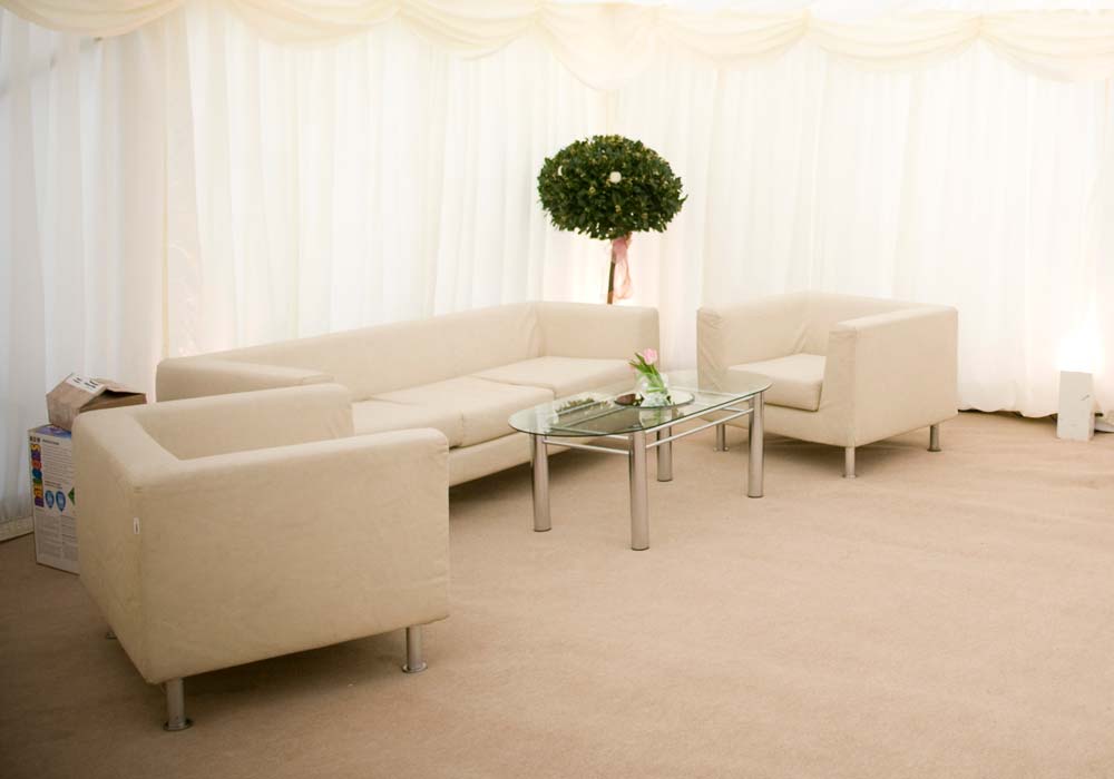 So much choice for your chairs and it is critical that whatever you choose blends in with the rest of the marquee. You can choose coloured swagging and covers, white or gold chairs or perhaps add something special of your own. Just make sure they are comfortable enough for the speeches! we can also supply some beautiful cream sofas, that look amazing and give some of your guests a different place to sit, while photographs are being taken or for in the evening.