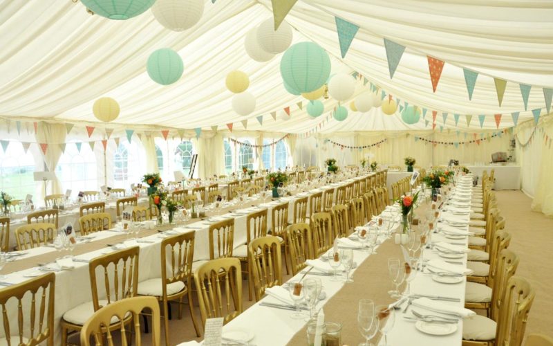 We normally suggest that you have a classic cream marquee as a starting point. Then the decoration can be tailored to your colour scheme and ideas of how you want it to look. From the style of chairs, layout of tables, to the choice of dance floor, lighting, flowers etc etc. There is lots of exciting bits to choose at this point and most couples really enjoy decorating their marquee.
